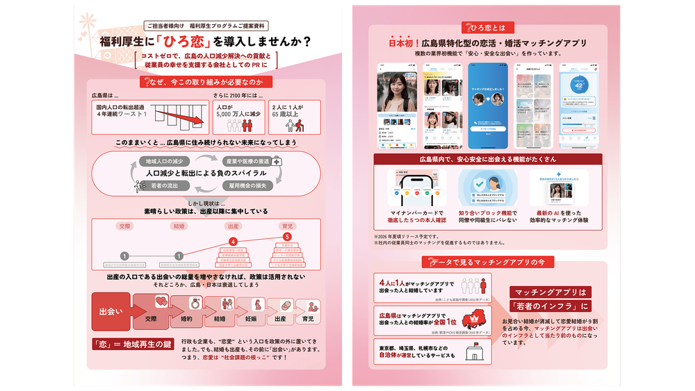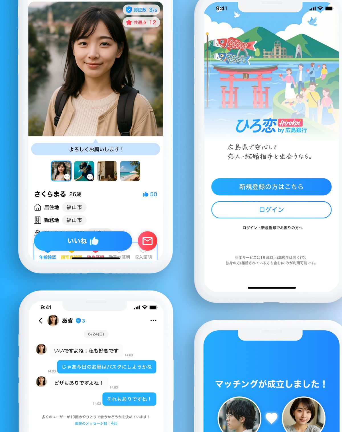 広島銀行様が出資し、地方創生・人口減少といった社会課題の解決をダイレクトな目的とした広島特化型の新規マッチングアプリ開発プロジェクト。その公共性と事業ポテンシャルから、広島県庁が運営するベンチャー支援事業「ひろしまユニコーン10」にも採択されるなど、強力なステークホルダーによるバックアップを受けた大規模な0→1立ち上げ案件です。